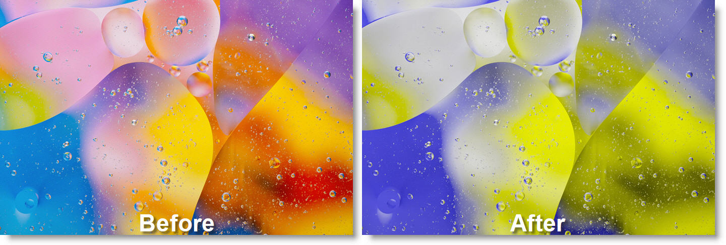 Generates a dual color-channel version of the image, as might be perceived by the limited color vision system of dogs. Humans have three color receptors (for red, green, and blue) while dogs have only two receptors (for yellow and blue).