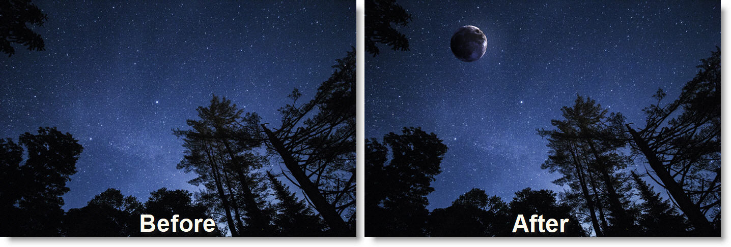 Screens the moon with the background. Nice for daytime shots.