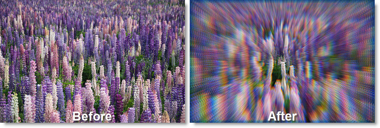 Separates the image into spectral bands and warps them by different amounts. The red is warped by the From transformation, the blue by the To transformation, with the other colors of the spectrum in between.