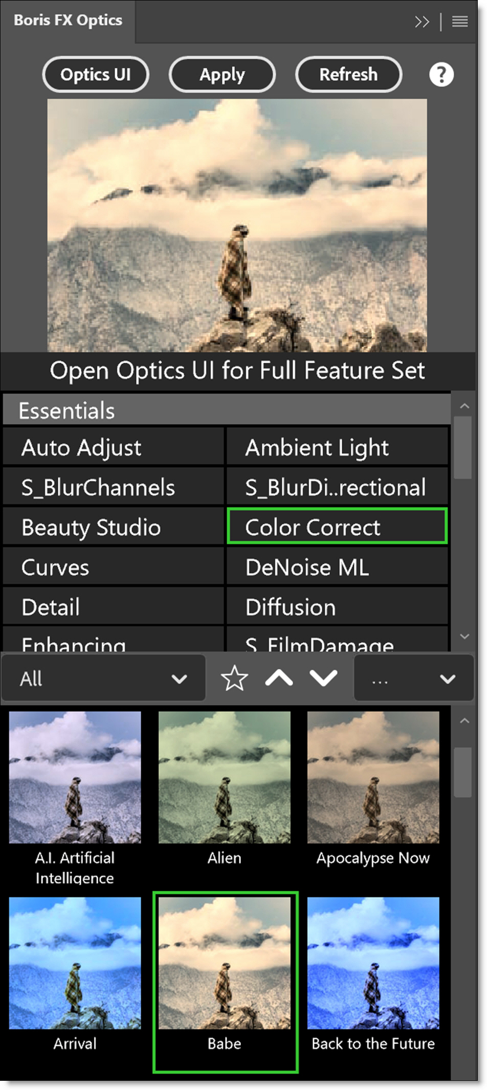 To open the panel, select Plugins > Plugins Panel and click Boris FX Optics.